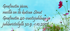 Grafinetin jäsen! Meillä on ilo kutsua Sinut juhlimaan kanssamme Grafinetin 40-vuotista taivalta Helsinki Congress Paasitorniin lauantaina 30.9.2017! Juhlat jatkuvat iloisissa merkeissä Itämeren aalloilla Silja Europalla. Ilmoittautuminen päättyy 4.8., toimi ripeästi. Lisätietoja tästä. |