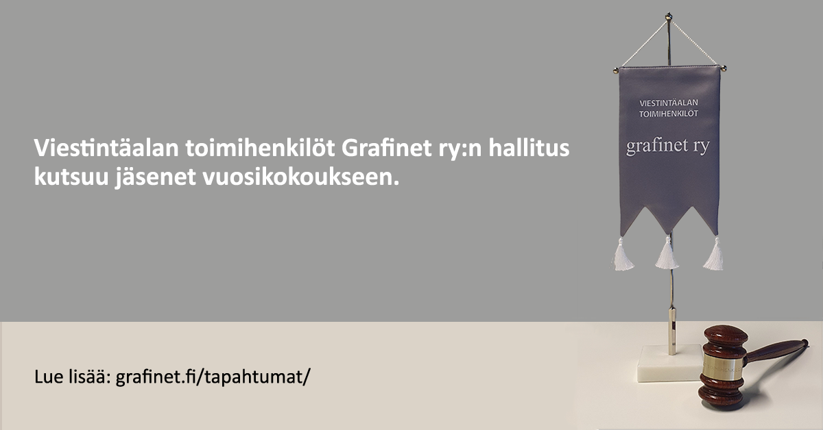 Viestintäalan toimihenkilöt Grafinet ry:n vuosikokous pidetään hybridikokouksena lauantaina 21.3.2026 klo 12.00 Scandic Tampere City hotellissa.Kokoukseen voi osallistua saapumalla kokouspaikalle osoitteeseen Hämeenkatu 1, 33100 Tampere tai etäyhteydellä Teamsin välityksellä.